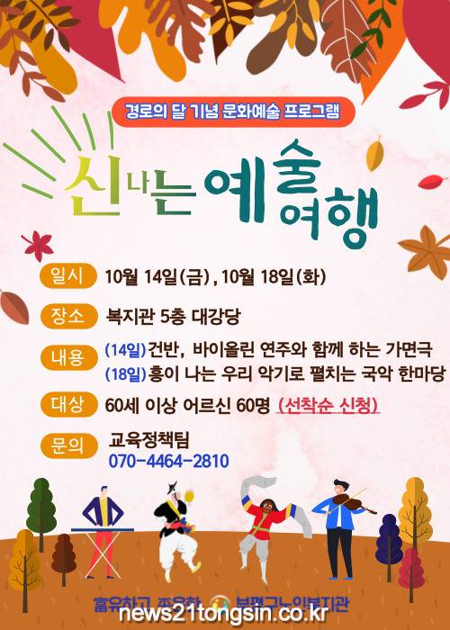 부평구노인복지관(관장: 최민수)은 10월 노인의 날과 경로의 달을 맞이하여 오는 14일, 18일 양일간 어르신과 함께 떠나는 ‘신나는 예술여행’ 공연을 복지관 대강당에서 진행한다고 밝혔다.