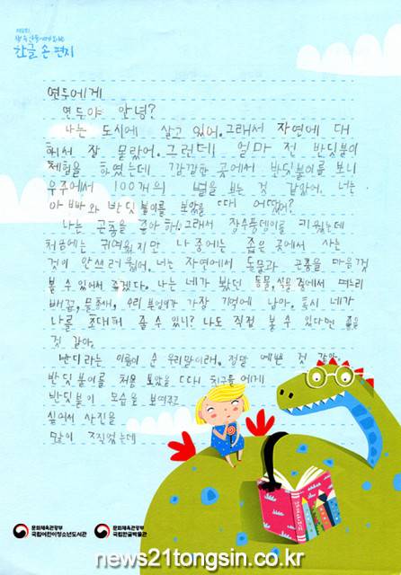 ‘책 속 인물에게 보내는 한글 손 편지’ 공모전은 디지털 환경에 익숙한 어린이들이 책 읽기의 즐거움과 한글의 아름다움을 느껴볼 수 있도록 마련된 행사다. 올해는 전국 100개 도서관에서 2395명의 어린이가 참여했다.