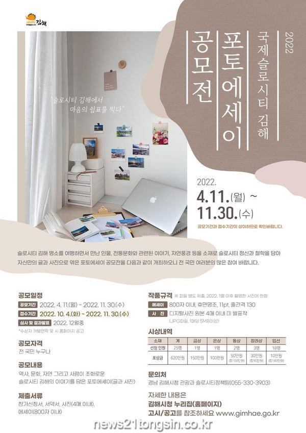 김해시는 11월 30일까지 ‘2022년 국제슬로시티 김해 포토에세이’를 공모한다고 13일 밝혔다.