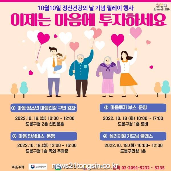 ▲ 사진=도봉구청도봉구(구청장 오언석)는 2022년 10월 18일 정신건강의 날을 맞아 정신질환에 대한 편견을 없애고, 정신건강에 대해 바로 알고자 ‘이제는 마음에 투자하세요’라는 주제로 정신건강의 날 기념 행사를 연다.
