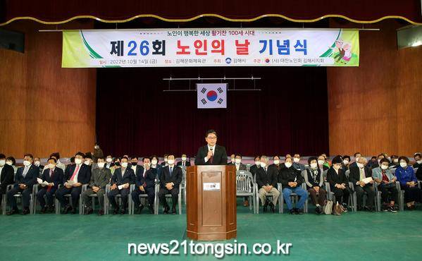 대한노인회 김해시지회는 14일 김해문화체육관에서 관내 경로당 회장과 노인들이 참여한 가운데 ‘어른다운 노인으로 건강 100세 시대’를 주제로 제26회 노인의 날 기념식을 개최했다.