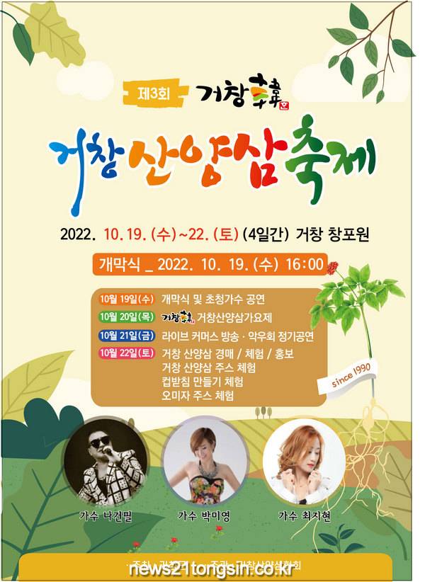 축제는 개막식을 시작으로 거창산양삼 홍보 및 판매부스, 축하공연, 전국가요제, 산양삼 판매 라이브 커머스, 산양삼 경매 행사와 체험 프로그램 등 다채로운 행사로 구성될 예정이다.