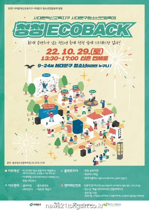 서대문구는 10월 29일 오후 1시 30분부터 5시까지 신촌 연세로에서 청소년연합축제 ‘청청 ECOBACK’을 개최한다.