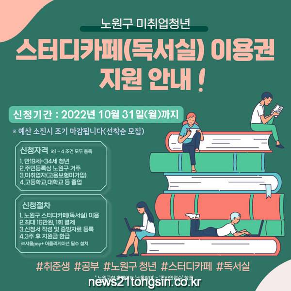지원을 원하는 경우 오는 10월 31일까지 노원구청 홈페이지-소통참여-온라인 접수를 통해 신청서와 관련 서류를 접수하면 된다. 단, 대학(원) 재학생, 휴학생, 군 복무 중인 자, 상반기 ‘노원찬스3’ 중 스터디카페(독서실) 이용권 기지급자는 신청에서 제외된다.