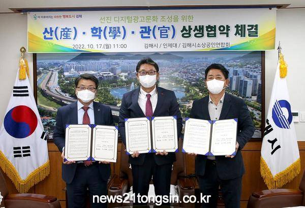 김해시(시장 홍태용)는 17일 시장실에서 인제대학교(총장 전민현), 김해시소상공인연합회(회장 김길수)와 우수 인재 양성, 지역경제 활성화, 쾌적한 도시환경 조성을 목적으로 산ㆍ학ㆍ관 상생협약을 체결했다.