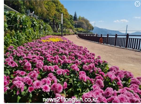 출렁다리 주변에도 국화가 만발해 바다 구경에 낭만을 더한다. 돝섬 잔디광장에는 제22회 마산국화축제와 연계한 화려한 국화 조형물들이 29일부터 내달 9일까지 방문객을 맞을 예정이다.