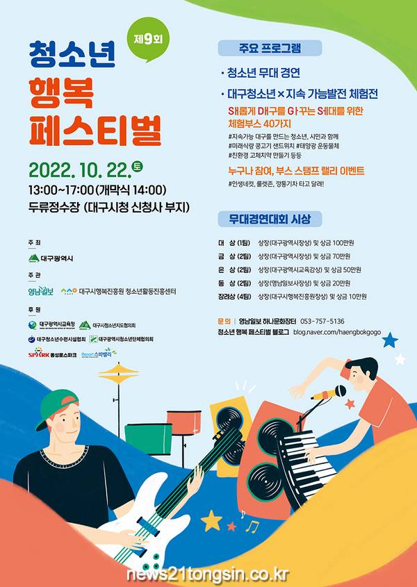 대구시가 주최하고 영남일보와 대구행복진흥사회서비스원(청소년활동진흥센터)이 공동으로 주관한 ‘제9회 청소년 행복 페스티벌’이 10월 22일(토) 오후 1시부터 옛 두류정수장(시 신청사 건립예정지)에서 개최된다.