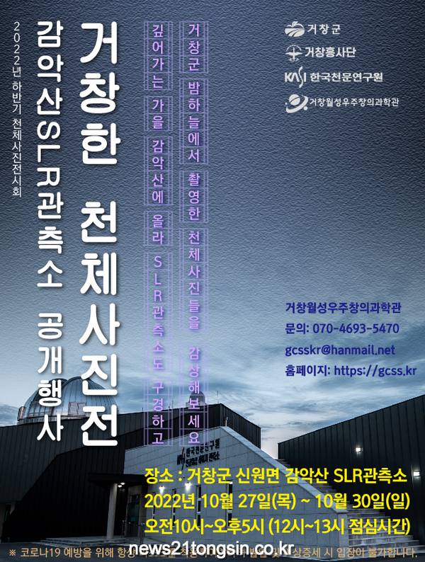 거창군은 오는 27일부터 30일까지 4일간 감악산 정상에 위치한 SLR관측소에서 ‘감악산 SLR관측소 공개행사-거창한 천체사진전’을 개최한다고 21일 전했다.