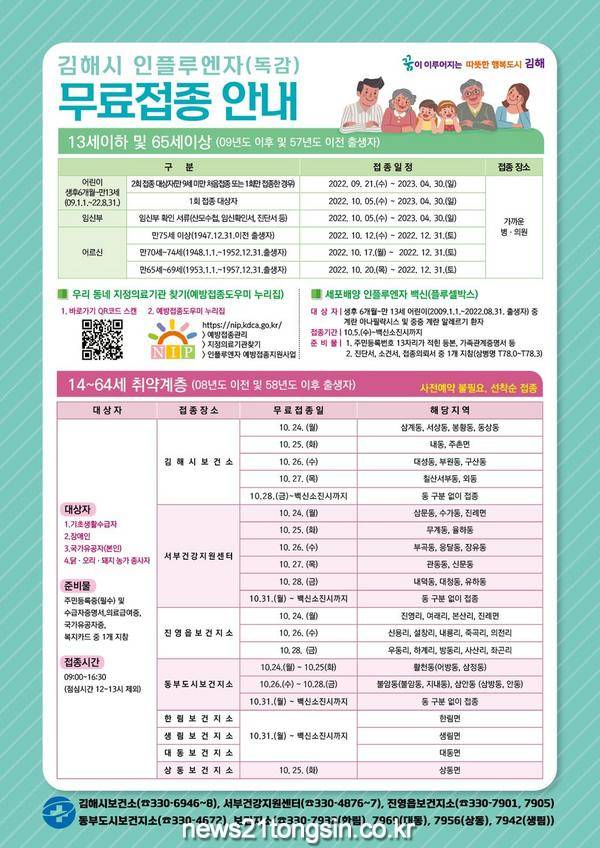 지자체 무료예방접종 대상은 김해시에 주소지를 둔 만14~64세 취약계층으로 기초생활수급자, 국가유공자(본인), 장애인, 닭·오리·돼지농가 종사자이다.