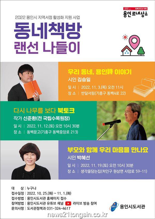 강연은 각 서점과 용인시도서관 공식 유튜브 채널을 통해 온·오프라인으로 진행된다. 온라인 참여를 하려면 25일부터 시 도서관 홈페이지를 통해 접수하면 된다.