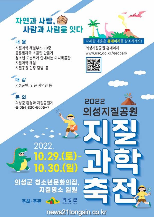 의성군은 10월 29~30일 의성군 청소년문화의집에서 ‘자연과 사람, 사람과 사람을 잇다’라는 주제로 ‘2022 의성지질공원 지질과학축전’을 개최한다.