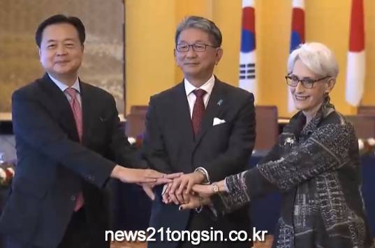 우리나라 조현동 외교부 1차관과 미국 국무부 웬디 셔먼 부장관, 일본 외무성의 모리 차관이 도쿄에서 긴밀히 만났다.