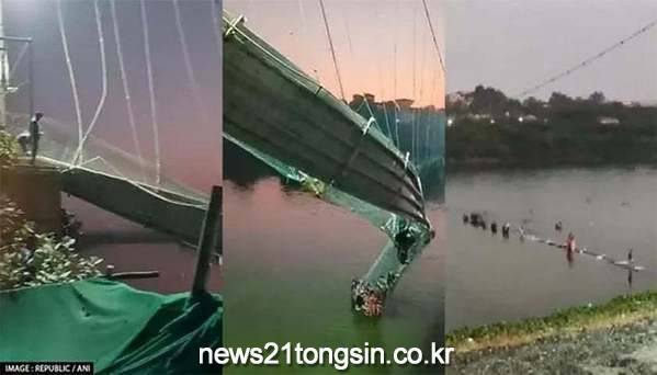 외신들을 종합하면 현지시각 30일 저녁 인도 서부 구자라트주(州) 모르비 지역 마추강을 가로지르는 현수교가 붕괴해 다리 위에서 축제를 즐기던 사람들이 강으로 추락했다.