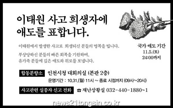 인천광역시(시장 유정복)는 10월 31일 시청 2층 대회의실에 이태원 사고 사망자 합동분향소를 설치하고, 이날 11시 30분부터 상황이 종료될 때까지 운영할 계획이라고 밝혔다.