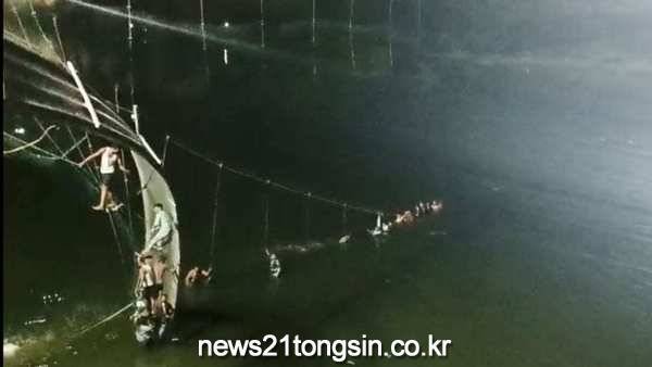 현지시간으로 30일 오후 6시 반쯤 현수교를 지탱하던 케이블이 끊어지면서 길이 233미터인 다리가 무너졌는데, 힌두교 축제 기간이라 인파가 몰려 사고 당시 다리가 감당할 수 있는 수준을 3배 이상 초과한 500명 정도가 접근해 있던 것으로 확인됐다.