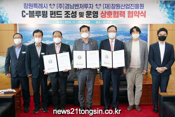 창원특례시(시장 홍남표)는 1일 오전 10시 시청 접견실에서 ㈜경남벤처투자·창원시·창원산업진흥원 관계자가 모여 C-블루윙 펀드 2호 ‘차세대 지역뉴딜&바이오 펀드’의 조성과 원활한 운영을 위한 상호협력 협약을 체결했다고 밝혔다.