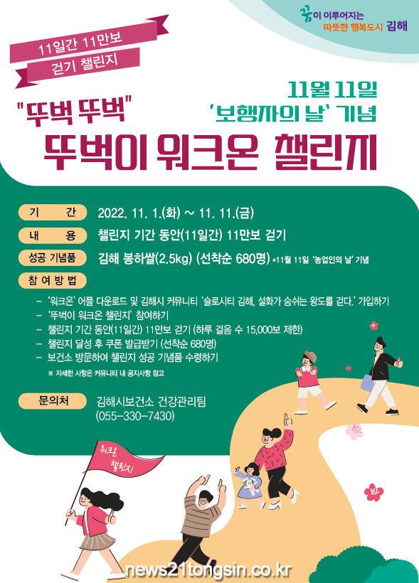 김해시보건소는 내달 1일부터 11일까지 ‘11일간 11만보 걷기’, “뚜벅뚜벅” 뚜벅이 워크온 챌린지를 실시한다고 밝혔다.