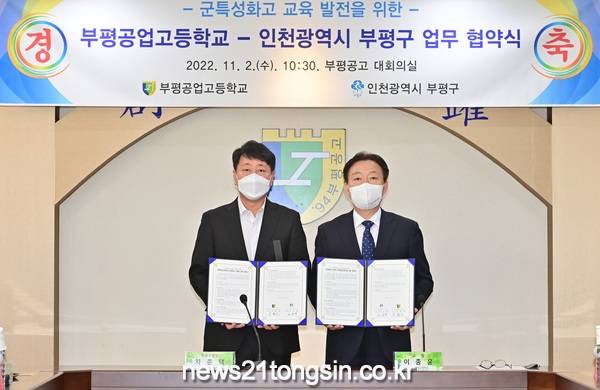 부평구(구청장 차준택)는 2일 부평공업고등학교 대회의실에서 부평공업고등학교와 군 특성화고 교육 발전 지원을 위한 업무협약을 체결했다.