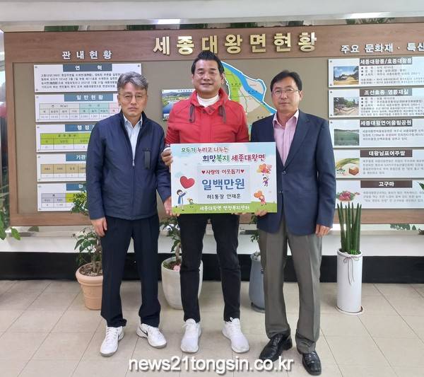 또한 기탁 받은 이웃돕기 성금 100만원은 세종대왕면 희망온누리 계좌로 입금하여 관내 취약계층을 지원하는데 쓰일 예정이다.