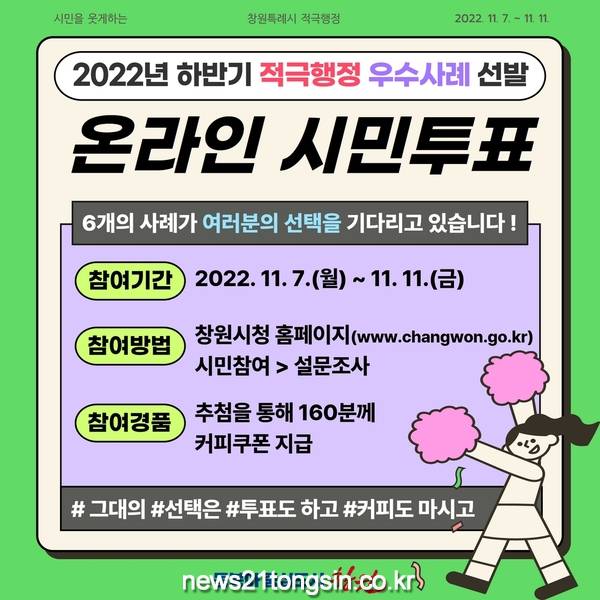 창원특례시(시장 홍남표)는 7일부터 11일까지 창원시 적극행정 우수사례를 선발하기 위해 창원시청 홈페이지(www.changwon.go.kr)에서 시민투표를 시행한다고 4일 밝혔다.