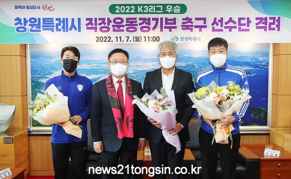 창원특례시(시장 홍남표)는 7일 ‘2022 K3리그’에서 우수한 성적으로 우승한 시 축구단 감독 등 선수단 및 축구협회 관계자를 시청으로 초대해 우승 트로피 전달받고 축하와 격려의 자리를 마련했다.