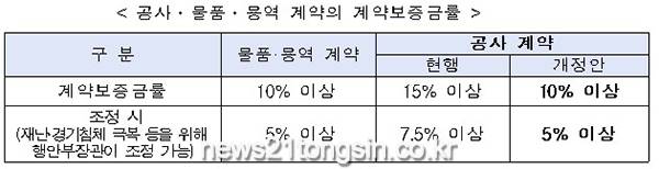 이와 함께 공사계약의 계약보증금률을 기존 15% 이상에서 10% 이상으로 하향조정하는 방안도 마련한다.