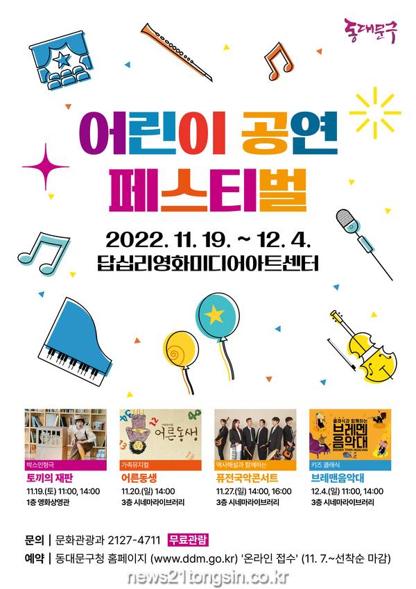 ▲ 사진=‘어린이 공연 페스티벌’ 홍보 포스터동대문구(구청장 이필형)가 오는 19일부터 12월 4일까지 답십리영화미디어아트센터에서 인형극, 뮤지컬 등 다양한 공연을 무료로 즐길 수 있는 ‘어린이 공연 페스티벌’을 개최한다.