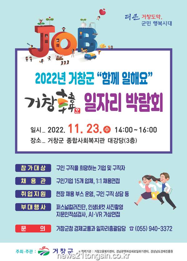 거창군은 오는 23일 거창군종합사회복지관 3층 대강당에서 ‘함께 일해요! 2022년 거창韓 일자리 박람회’를 개최한다고 9일 전했다.