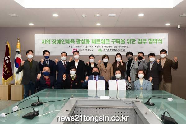 (뉴스21통신) 유재원기자 = 대구광역시장애인체육회는 14일 대구보건대학교와 지역 장애인스포츠 네트워크 구축을 위한 업무협약을 체결했다.