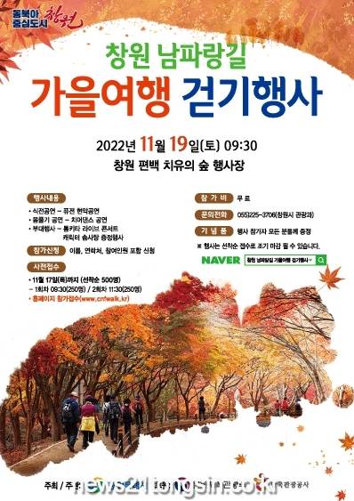 정진성 창원특례시 관광과장은 “단풍이 물든 숲길과 푸른 바다 풍경이 어우러진 창원의 남파랑길을 걸으며 건강도 챙기고, 가을 정취도 만끽할 수 있는 이번 행사에 많은 분의 참여를 바란다”고 말했다.