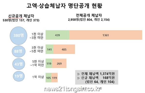 경상북도는 16일 홈페이지와 도보, 위택스(지방세 납부 사이트)를 통해 지방세 및 지방행정제재·부과금에 대한 고액․상습체납자 530명(개인 373, 법인 157)의 명단을 공개했다.