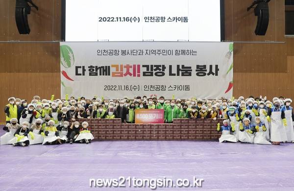 인천광역시(시장 유정복)는 11월 16일(수) 인천공항 스카이돔 체육관에서 (사)인천광역시자원봉사센터, 인천공항 합동자원봉사단, 영종지역 주민, 자원봉사자 등 140명이 참석한 가운데 ‘다 함께 김치! 김장나눔 봉사!’행사를 개최했다고 밝혔다.