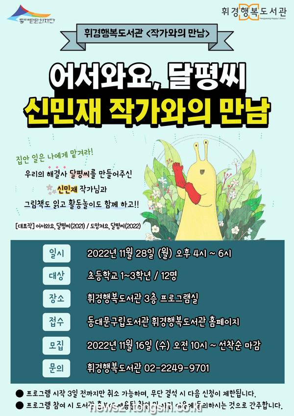 신민재 작가와의 만남은 동대문구립도서관 휘경행복도서관 누리집(https://www.l4d.or.kr/hgh)에서 신청할 수 있으며, 선착순으로 12명을 모집한다. 보다 자세한 사항은 휘경행복도서관(02-2249-9701)으로 전화 문의 하면 된다.