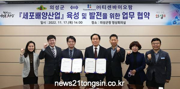 의성군과 ㈜티센바이오팜(대표 한원일)은 지난 17일 군청 영상회의실에서 업무협약을 맺고 의성군 세포배양산업 발전을 위해 상호 협력하기로 했다.