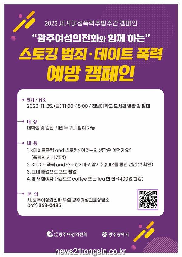 먼저, 25일에는 전남대학교 도서관 별관 앞에서 시민들을 대상으로 ‘데이트폭력, 스토킹 등 신종 젠더폭력 바로알기’ 캠페인을 열고 ▲데이트폭력과 스토킹 범죄 인식 점검 ▲스토킹 관련 법률 개정안 바로알기 퀴즈 ▲젠더폭력 피해자 지원 기관 홍보 등을 펼친다.
