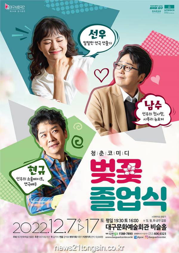 (뉴스21통신) 유재원기자 = 대구시립극단은 제54회 정기공연으로 청춘코미디 연극 <</span>벚꽃 졸업식>을 12월 7일(수)~12월 17일(토) 대구문화예술회관 비슬홀에서 공연한다.