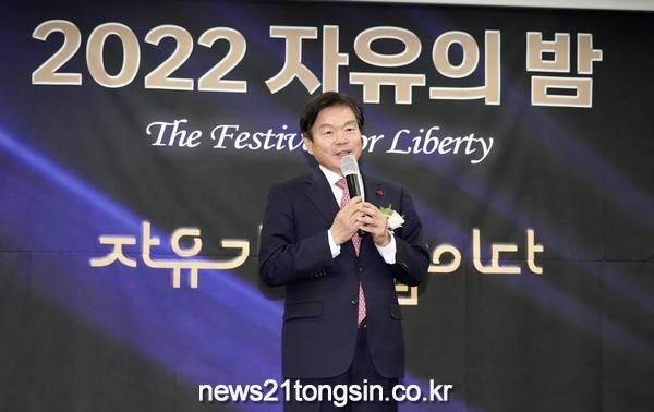 ▲ 사진=이필형 동대문구청장이 21일 오후 ‘2022 자유의 밤’에 참석해 수상 소감을 말하고 있다. 이필형 동대문구청장이 21일 시장친화적 리더십과 지방분권·자치수준 제고 활동 공로를 인정받아 자유기업원이 최초로 수여하는 ‘2022 자유경제자치상’을 수상했다.