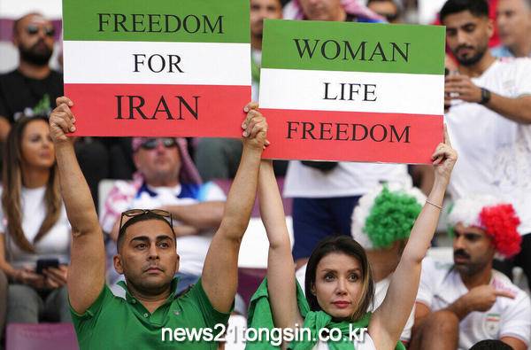 시위대는 "여성, 생명, 자유" 등의 구호를 외치고 있다.