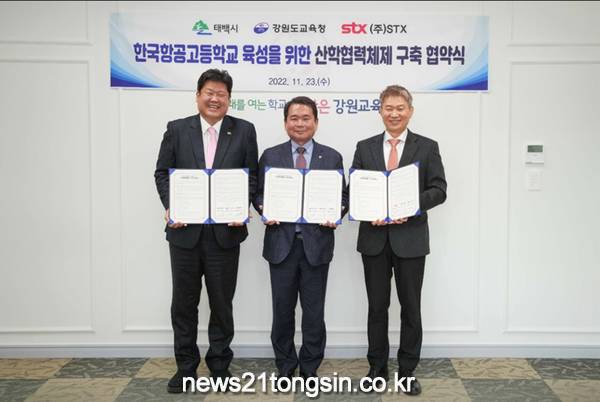 태백시(시장 이상호)는 23일 강원도 교육청에서 강원도 교육청 및 ㈜STX와 2024년 3월 재개교 예정인 한국항공고등학교 육성을 위한 산학협력체제 구축 협약을 체결했다.