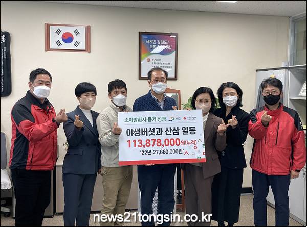 네이버밴드 야생버섯과 산삼 동호회(회장 최원식)는 24일 강원도청에서 도내 소아암 환아 의료비 지원을 위해 2,700여 만원을 기탁하였다.
