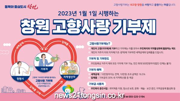 내년 본격적인 시행에 대비해 창원특례시는 10월 조직개편시 전담팀인 고향사랑기부팀을 세정과에 신설 후 본격적인 준비에 돌입하여 창원시 고향사랑기부금 모금 및 운용에 관한 조례를 11월 제정하였고 기부 붐이 일어날 수 있도록 고향사랑기부제 홍보영상을 제작하여 각종 축제와 SNS를 활용하여 대대적인 홍보를 할 계획이다.