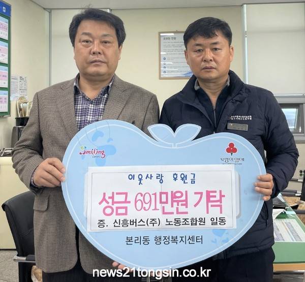 (뉴스21통신) 박창남기자 = 대구 달서구 본리동장은 23일 대구 신흥버스(주) 노동조합(지부장 윤종원)에서 평소 조합원들로부터 모아둔 성금 691만원을 이웃돕기 후원금으로 기탁받았다고 밝혔다.