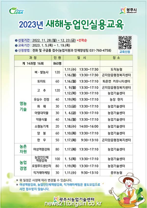 광주시는 광주시민 860명을 대상으로 2023년 1월 5일부터 19일까지 새해농업인실용교육을 실시할 계획이라고 25일 밝혔다.