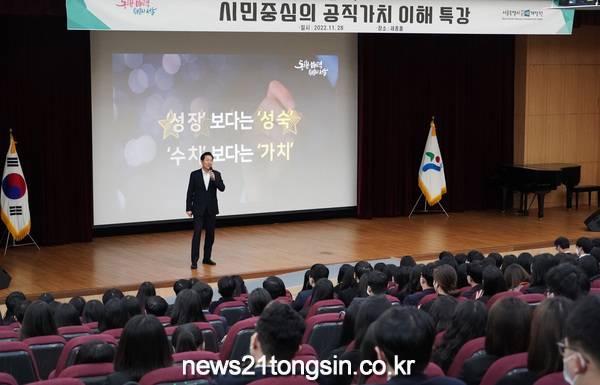오 시장은 인사말을 통해 공직에 첫발을 내딛는 신임자들을 격려하고 미래 서울의 정책을 이끌어 갈 주인공들의 바람직한 공직자세를 당부하였으며 특강을 통해 약자와 동행하는 상생도시 ‘동행 특별시 서울’(▲취약계층 5대 정책 ▲아이 키우기 좋은 도시)과 매력 있는 글로벌 선도도시 ‘매력 특별시 서울’(▲글로벌 선도도시 ▲미래 감성도시)을 소개했다. 또한, 교육생과 격의 없는 질의응답 시간을 가졌다.