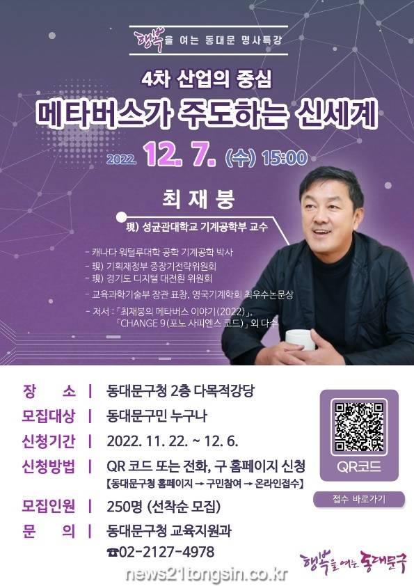 ▲ 사진=행복을 여는 동대문 명사특강 홍보 포스터동대문구(구청장 이필형)가 12월 7일 오후 3시 동대문구청 2층 다목적 강당에서 국내 최상위 메타버스 전문가인 최재붕 교수를 초청해 ‘4차 산업의 중심-메타버스가 주도하는 신세계’를 주제로 특강을 진행한다.