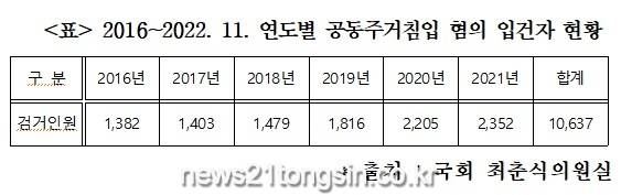 국회 농림축산식품해양수산위원회 소속 최춘식 의원이 경찰청의 자료를 조사 및 분석한 결과, 공동주거침입 혐의 입건자는 ‘16년 1,382명, ‘17년 1,403명, ‘18년 1,479명, ‘19년 1,816명, ‘20년 2,205명, ‘21년 2,352명 등 최근 6년간 매년 증가하여 총 10,637명에 달했다. 특히 지난해(2,352명)의 경우 16년(1,382명) 대비 5년새 입건자가 70% 급증한 것으로 확인됐다.