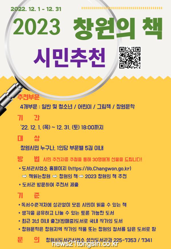 참고하거나 창원중앙도서관담당(☎055-225-7353 / 7341)으로 문의하면 된다.