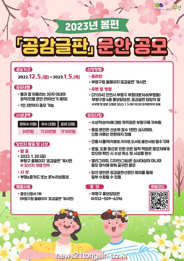 부평구(구청장 차준택)가 5일부터 다음 달 5일까지 1개월간 ‘2023년 봄편 공감글판’ 문안을 공모한다.