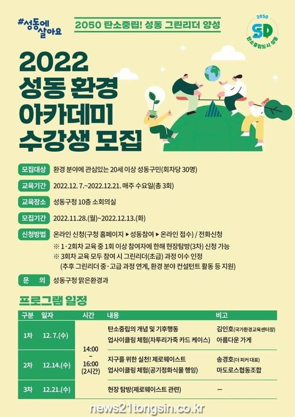 ‘성동 환경 아카데미’ 교육은 12월 7일, 14일, 21일 총 3회차로 구성된다. 1회차는 김인호 국가환경교육센터장이 ‘2050 탄소중립의 개념 및 기후행동’이라는 주제로 교육을 하고, 2회차에는 성동구 대표 제로웨이스트 라이프스타일 플랫폼을 운영하고 있는 ‘더 피커’의 송경호 대표가 ‘지구를 위한 실천! 제로웨이스트’라는 주제로 교육을 실시할 예정이다. 3회차에는 성동구 친환경시설인 서울새활용플라자와 성동구 친환경체험학습센터 현장탐방이 진행된다.