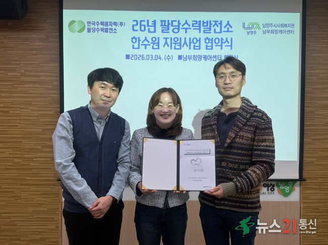 남양주시는 지난 4일 남부희망케어센터(센터장 최정선, 이하 센터)가 한수원(주)팔당수력발전소와 ‘함께 살기 조(안)와(부)’지원사업 진행을 위한 협약식을 개최하고 지역사회 복지 증진을 위한 협력체계를 구축했다고 6일 밝혔다.이번 사업은 한수원(주)팔당수력발전소에서 진행한 ‘2026년 사업자 지원사업 공모’에 선정돼 .